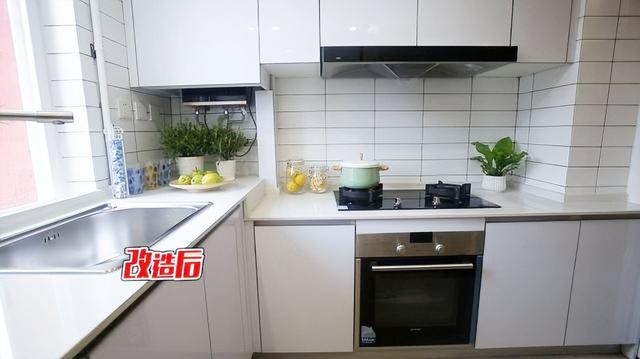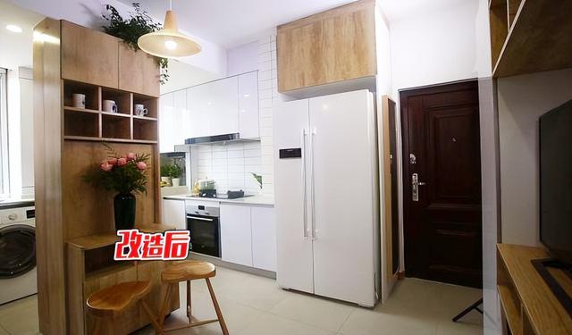 将厨房和卫生间之间的墙壁拆除,创造出开放式的厨房和客厅空间,视觉上变得宽敞了许多。额外的橱柜提供充足的存储空间。