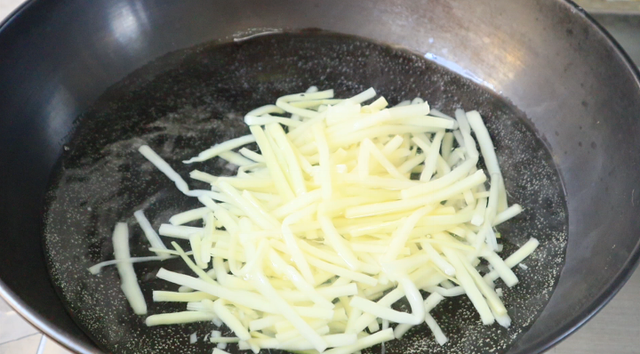 第二步、竹笋丝开水下锅,大火焯水2分钟左右,焯好后捞出沥水备用。