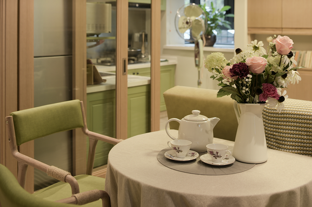 设计师在设计客厅时,增加了大量定制橱柜,完美地满足了客厅收纳的需求。利用窗户不显眼的角落,我为林女士的父亲搭了一张手工制作的桌子,让老人在这里有一个小小的独立空间。