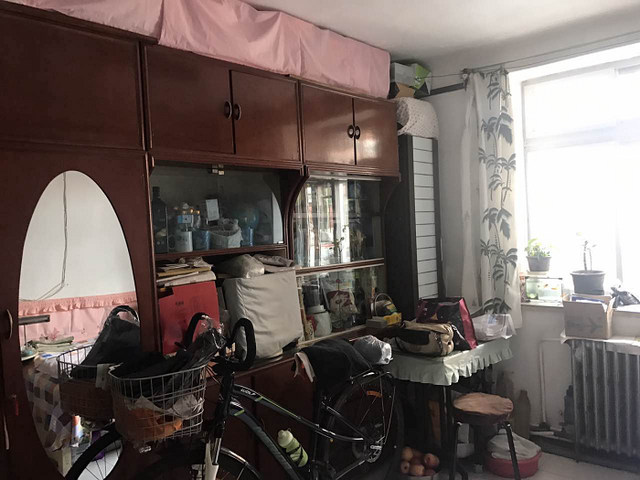 自行车、缝纫机等杂物都堆在客厅里,整个房间很乱很拥挤。