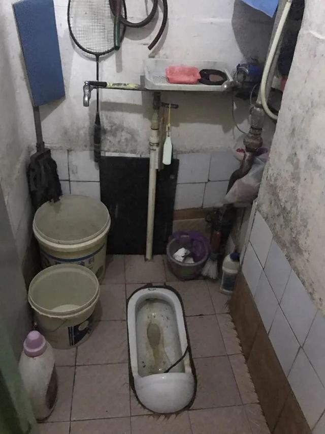 装修前,厕所只有4平方米,很窄。家长洗澡时,要盖上蹲便器,站在这里洗澡。