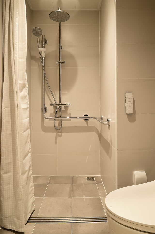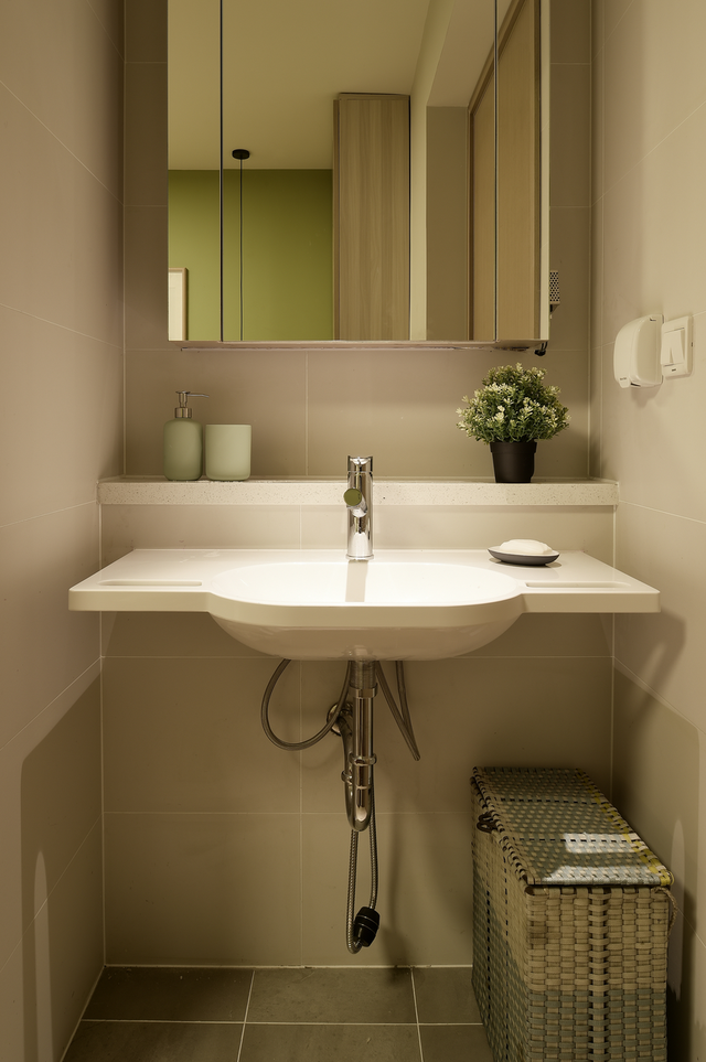 卫生间内的洗涤区与卫生间和洗浴区分开设计,空间井然有序。在这里,考虑到老年人的方便性,脸盆选择了无障碍设计,并配有扶手。