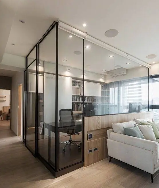为了应对网络的流行和快速发展,居家办公正在成为一种常见的办公方式。如果你担心在工作中不能照顾到宝宝的动态,就把工作区规划在客厅旁边,并使用玻璃推拉门或小隔间来设计,也可以边工作边照顾孩子。
