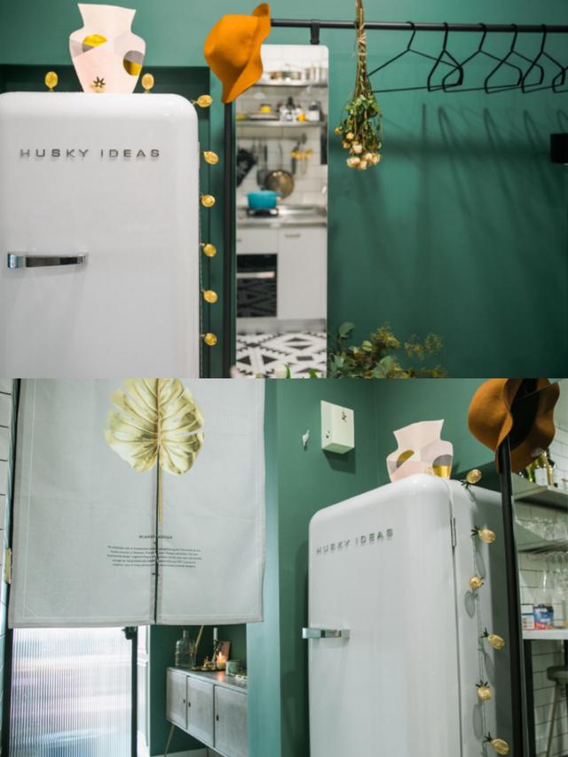带冰箱和玄关衣架的绿墙一直延伸到卧室外面,从门厅望向卧室的窗帘起到了很好的空间分隔作用。
