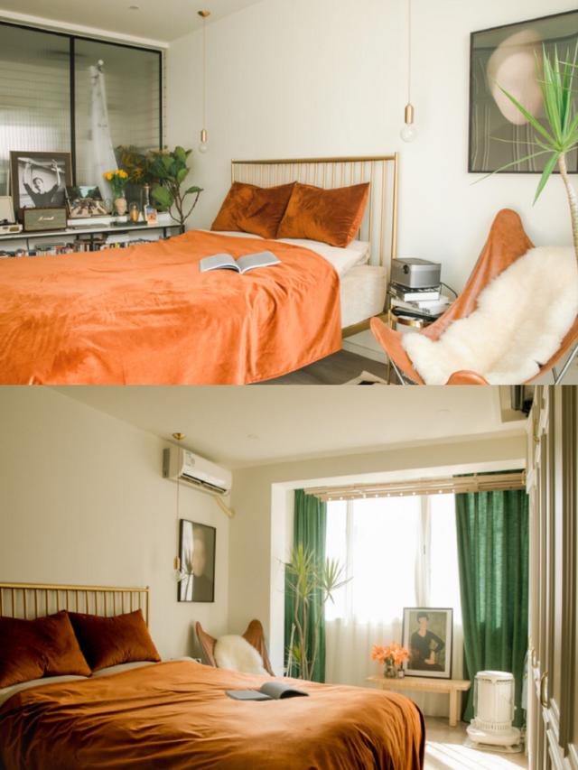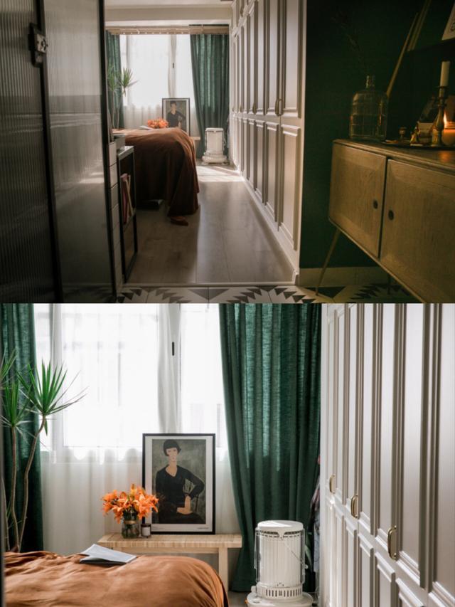 本案中的卧室充满了复古的绿色金属元素,感觉充满了港风。床对面的大衣柜满足收纳需求。每次看这个衣柜,你都会把自己想象成