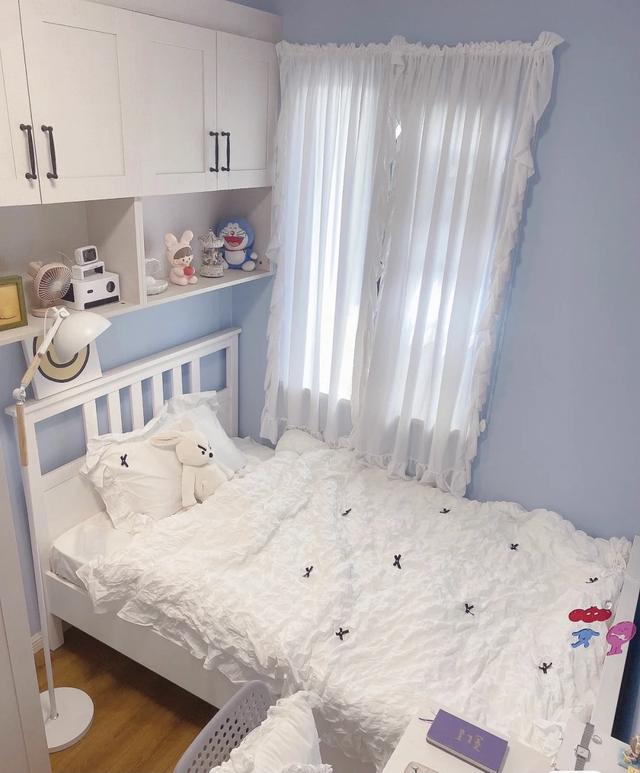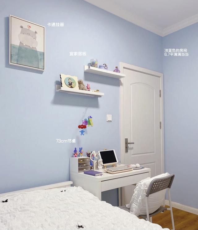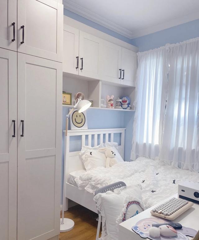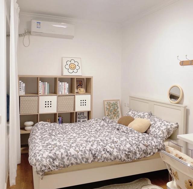 儿童房6.7㎡,这里没有像大部分家庭一样安排榻榻米。说实话榻榻米虽然增加了收纳,但个人认为在床榻等地方增加收纳真的对健康有些影响。为了孩子的健康着想,她家安排了实木床架,简单却又舒适。