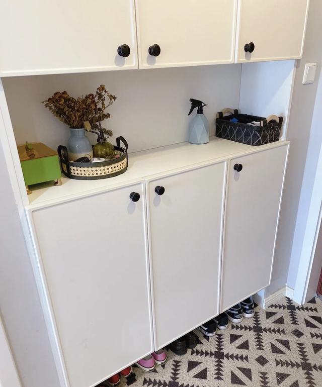 左边的顶天立地鞋柜,中间镂空,方便随手放置一些零碎小物。最下方空出一部分,让鞋子随叫一踢就能让它们“回家”!