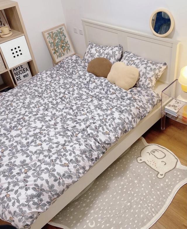 主卧室12平米,床是1.85m*2m的,白橡木浅浅的颜色,让卧室变得奶fufu的,给人一种温馨的感觉。
