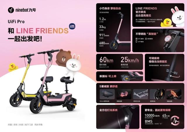 九号电动滑板车UiFi Pro LINE FRIENDS联名款,则是一款新国标车型,可上牌。这款滑板车在外观设计上选择了跟LINE FRIENDS联名,车身有黄、粉两种配色。
