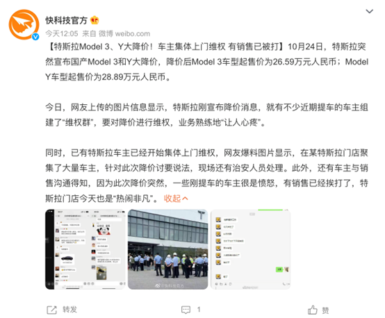 因为照片中有警车停放在中心门口,并且有身穿制服的警察和辅警出现在中心门口,因此也有不少人深感疑惑,为何这样一次“维权行动”居然就“惊动了”当地警方。而在当天中午,就有自媒体爆料称,因为有部分车主对特斯拉降价一事很是愤怒,竟然动手殴打销售人员。当然了,对于苏州特斯拉交付中心到底有没有发生打人事件的事实,我们最终还是要以警方或是特斯拉方面的通报为准。不过可以肯定的是,特斯拉这一次的价格调整,不仅使得部分车主“多掏腰包”,而且也令不少竞争对手压力山大。