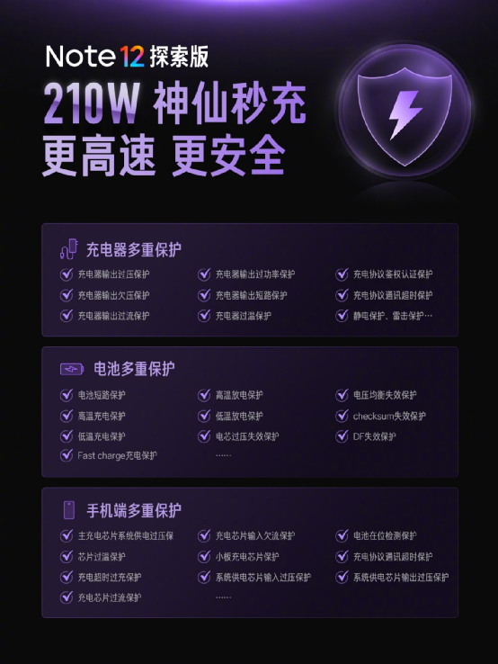 比如这次的210W快充。快充不是简单的功率叠加,涉及到电池、电芯、充电线、充电头等多个维度,Redmi Note 12探索版为了支持210W快充,修改了主板设计,加入更比同系列更好的散热。当然,安全问题不用想太多,Redmi敢拿出来商用说明它的安全性是可以保证的,快充也不会影响到电池寿命,该怎么充就怎么冲。
