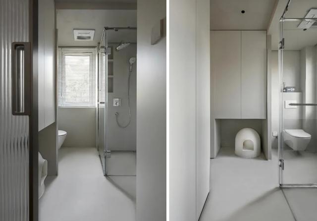 动线的中央是一组更衣室,一侧还设计了备用清洁工具柜,并为“猫厕所”预留了空间。剩下的空间就是卫生间区域和淋浴房的划分。?