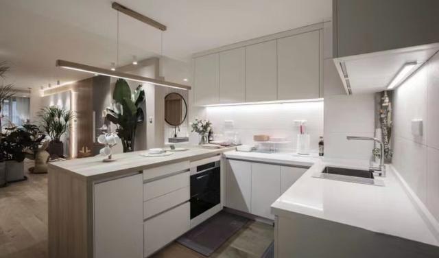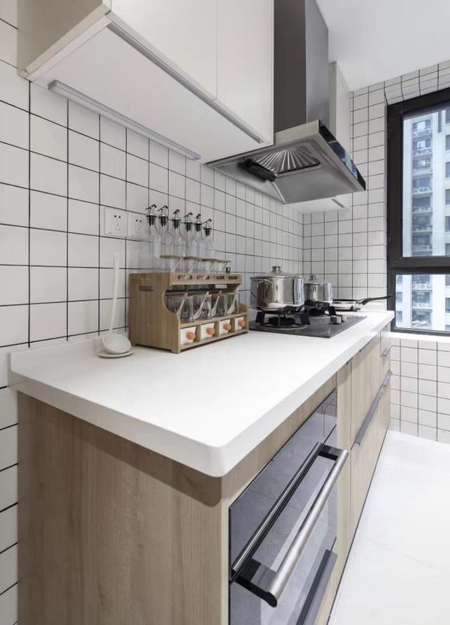厨房设计成“U”型动线分布,一边是操作台,一边是智能家电,大量定制隐形橱柜,让原本狭小的空间有了充裕的操作空间和收纳空间。