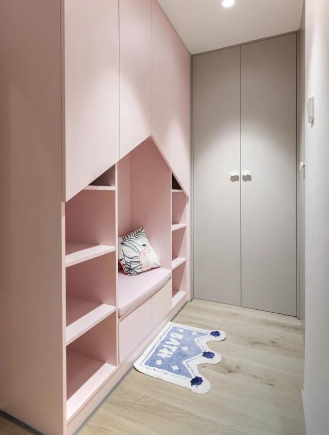 墙面左侧的柜子利用柜门做屋顶造型,营造出童趣空间。中间的卡座可以方便孩子换衣服换鞋子,培养独立的习惯。