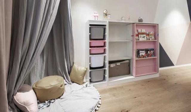 儿童房还定制了一套玩具边柜。孩子的身高刚好能摸到顶楼,定制了很多收纳盒,让她从小养成良好的收纳习惯。