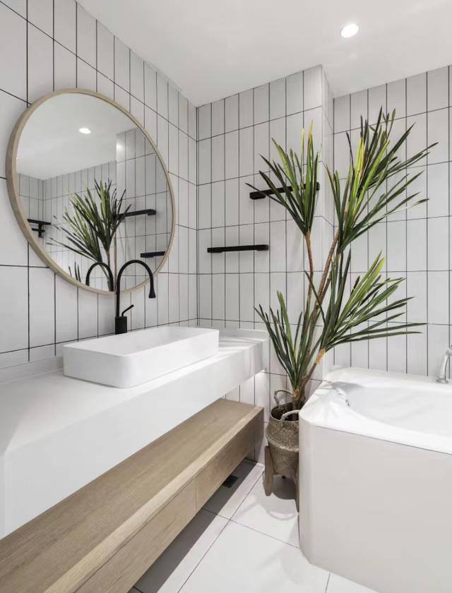 白色条形瓷砖搭配黑色淋浴房,搭配暖白色筒灯,让空间更加干净明亮。
