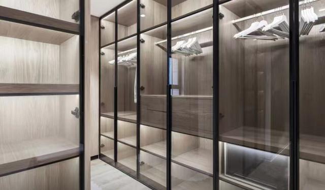 可谓是主卧收纳的“主力”。柜门也采用了非常窄的黑框玻璃门板,灯条嵌在里面。里面的衣服和展品一样明显。