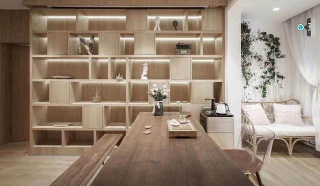 “书墙”旁边摆着一张长长的木桌,可以作为两三个朋友喝茶聊天生活的茶室。