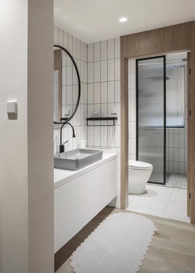 在潮湿区域的卫生间和淋浴区之间,用一个边框很窄的长虹玻璃隔断隔开,可以防止大部分水渍在洗澡时溅出,同时具有一定的私密性。