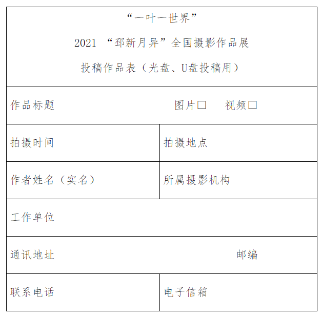 光盘、U盘包装盒上注明该作品征集的名称,每幅作品文件名处注明作品标题,同时提供作者资料及投稿作品表(word文档)。投稿作品为JPG格式,图片统一处理为长边800-1000像素,文件大小控制在200-500KB以内。无相关资料的投稿作品,主办单位有权取消其参评资格。