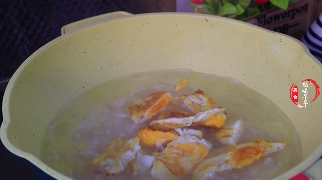 4、接着倒入蒜末炒出香味,然后倒入裙带菜翻炒几秒钟,下入煎好的鸡蛋,倒入足量的开水,一定要是开水,这样汤汁才会变得奶白。