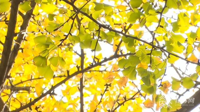美丽的扇形叶片变成柠檬黄色,绚烂夺目,在阳光的映照下,演绎着金色浪漫。微风吹过,树叶翩翩飞舞,一幅金色的油画跃然而生。慕名前来的游客,一边欣赏美景,一边拍照留念,流连忘返。