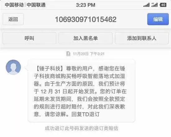 11月29日,锤子科技给购买其“畅呼吸”系列智能落地式加湿器的消费者发了条短信。它告知用户,加湿器将延迟发货,发货时间比此前承诺时间延迟月余。