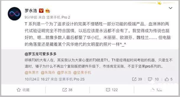 10月30日,罗永浩在微博上表示,T系列应该是不会再有了,并把T系列的失败归功于中国国情。