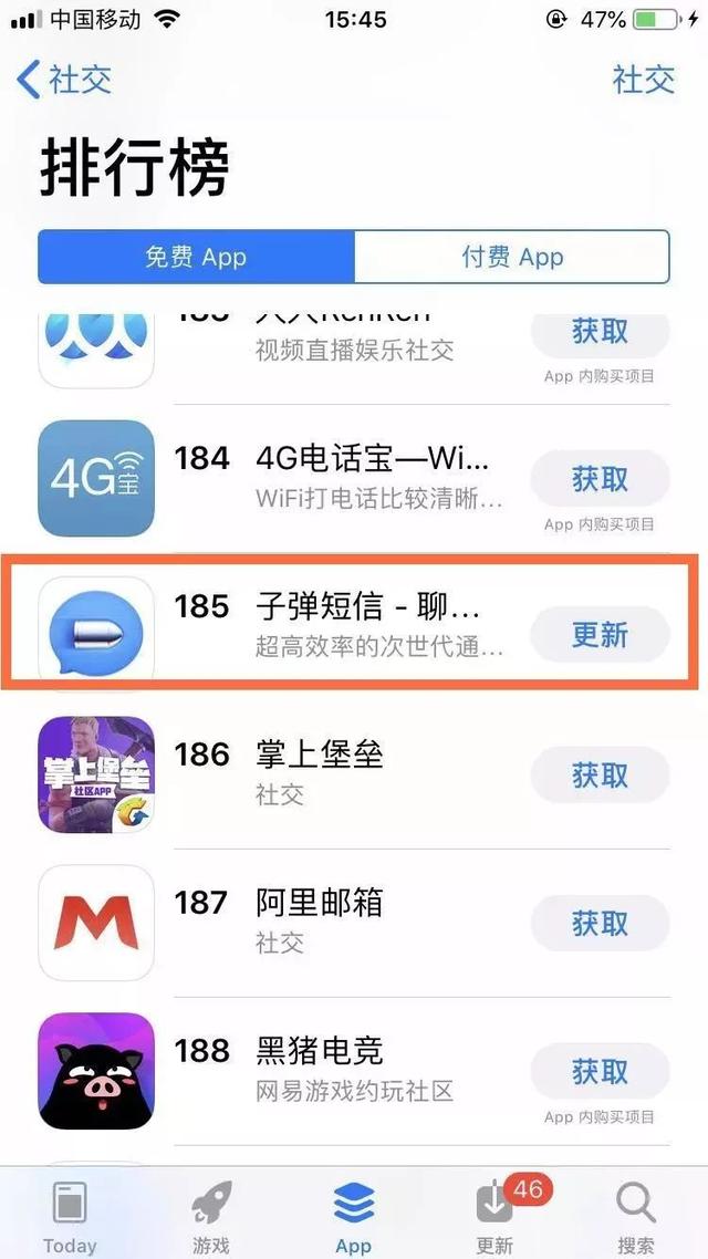 今天,子弹短信已经掉到App Store免费社交排行的185名了。