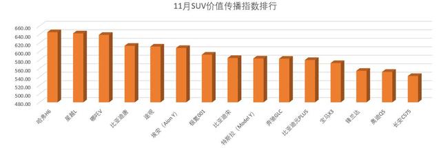 根据最新发布的11月SUV价值传播指数排行显示,排在第一位的是哈弗H6,指数值是645.20;第二位是星越L,指数值为642.39;第三位是哪吒V,指数值为638.83。