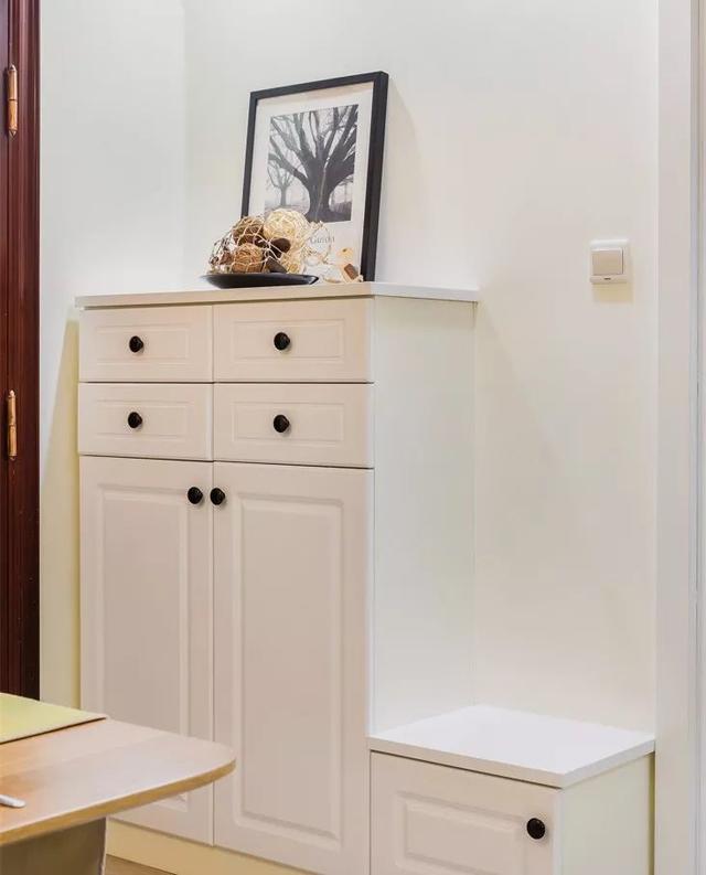 入户处的玄关鞋柜,采用矮鞋柜加上换鞋凳的设计,鞋柜上方摆放杂物和装饰画,白色柜子和墙面相互呼应,更显简洁。