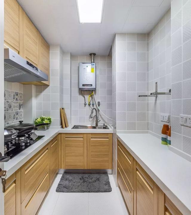 厨房设计成U型的布局,尽可能不浪费每一寸空间。采用原木风的柜门和白色的台面,墙面则铺上了色调不同的瓷砖,再加上花砖的点缀,看起来干净整洁。
