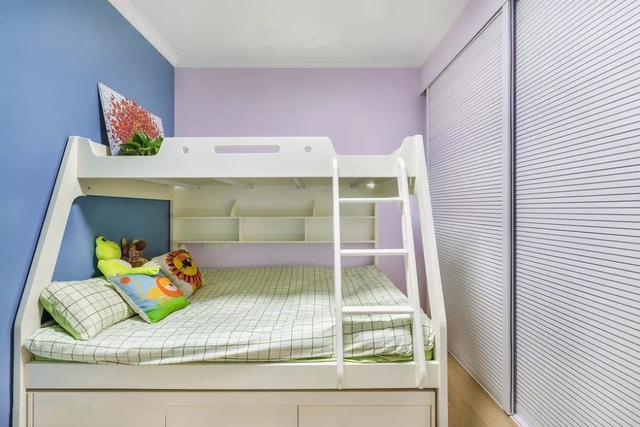 儿童房是做了高低床的设计,提高空间使用率,同样到顶的嵌入式衣柜,把整面墙空间都给用上,蓝色和紫色相间的墙面设计,也让儿童房多出变化。
