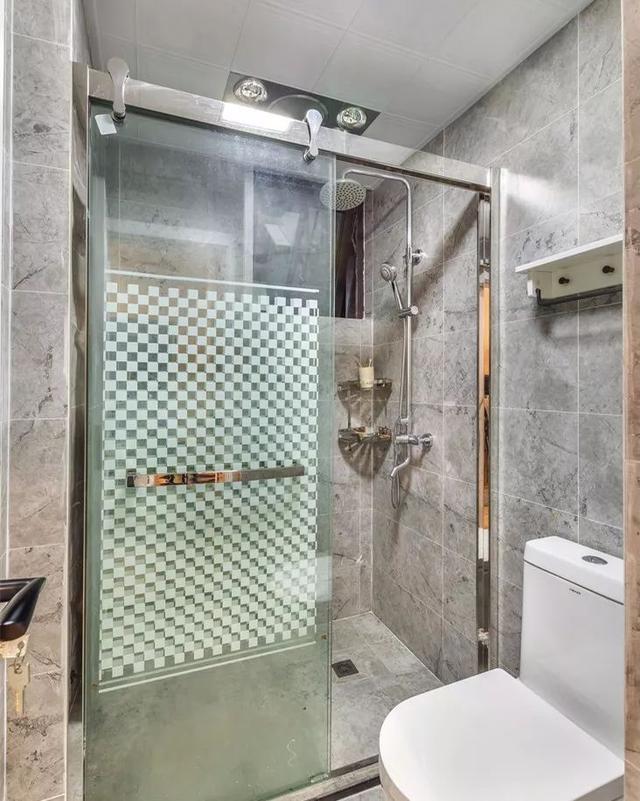 卫生间内部同样干湿分离,淋浴区和马桶之间做玻璃隔断,把水汽完全挡在淋浴区内,灰色大理石条纹瓷砖让卫生间更显时尚和大气。