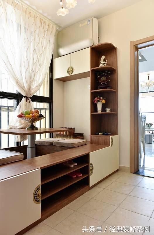 入户有个小小的空间,设计成塌塌米的样式,底下作为鞋柜,榻榻米还能充当会客区。