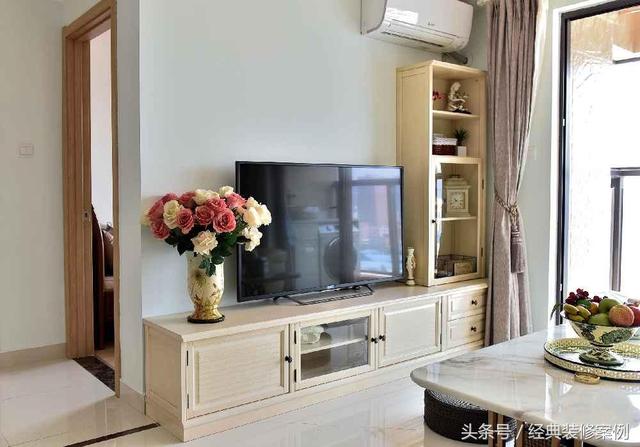 电视柜选择封闭式的,不容易积灰,靠近阳台还放了一个立柜,可以收纳客厅的一些小东西或者摆放装饰品。
