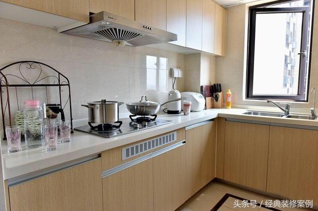 厨房以墙角为基点设计成L型,还做了一排吊柜来增加收纳空间。