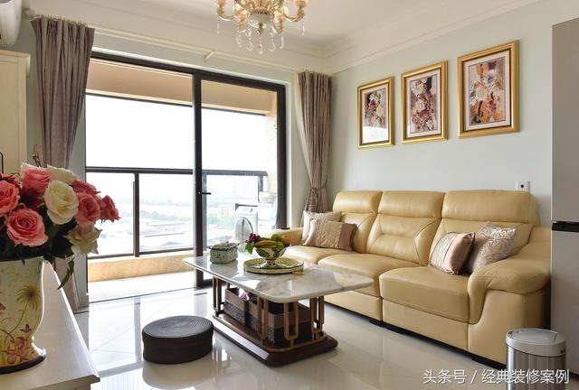 客厅采光非常好,与阳台之间用黑框玻璃门来进行隔断。沙发选择一字型沙发,上方三幅装饰画点缀墙面。