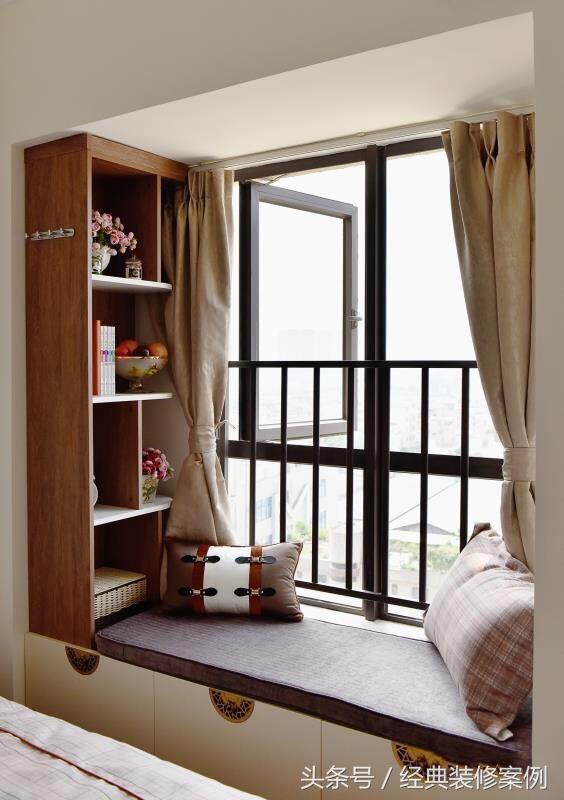次卧带有室内飘窗,底下是收纳用的抽屉。飘窗旁也设计了刚好的展示柜,不浪费任何一寸空间。