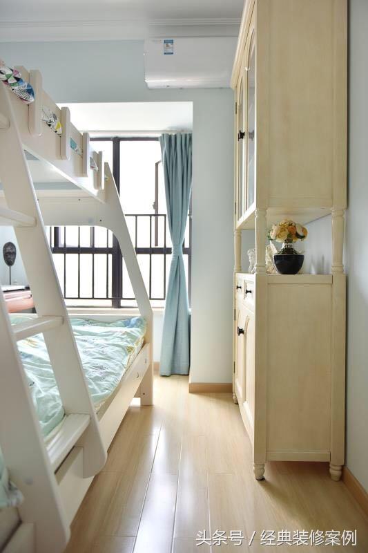 楼上儿童房选择的是上下铺,不止利用率高还高颜值。侧边是一个大柜子,中部留空以便摆放东西。