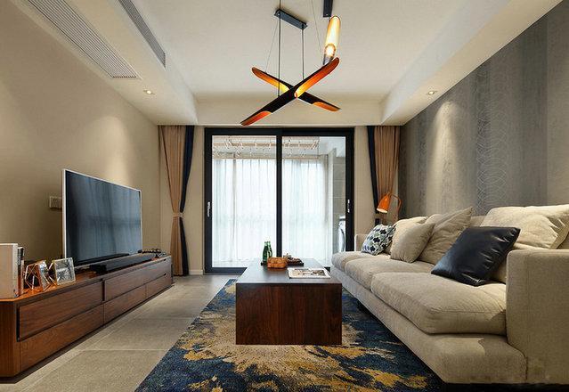 深邃蓝的镶花地毯搭配温馨的米色调布艺沙发和原木茶几
