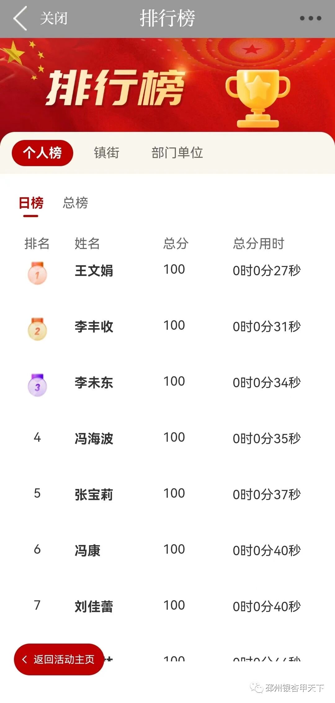 完成答题后,可查看个人积分和排行榜(个人榜、镇街榜、单位榜)。