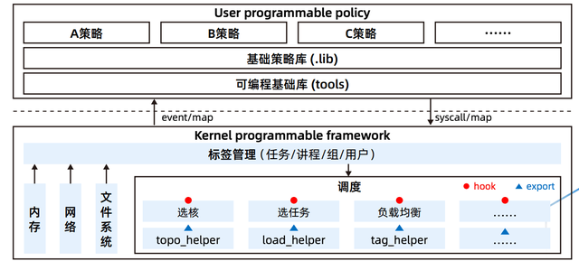 在这种情况下,对于内核进行组装,支持可编程能力,就变得极其重要。openEuler 创新性地借鉴了社区当中 eBPF 的思想,并在此基础之上,将内核的机制和框架进行了分离,将框架内置到内核,实现的功能和策略则可以在开发完成后,注入到内核中即可实现对内核二次编程的效果。