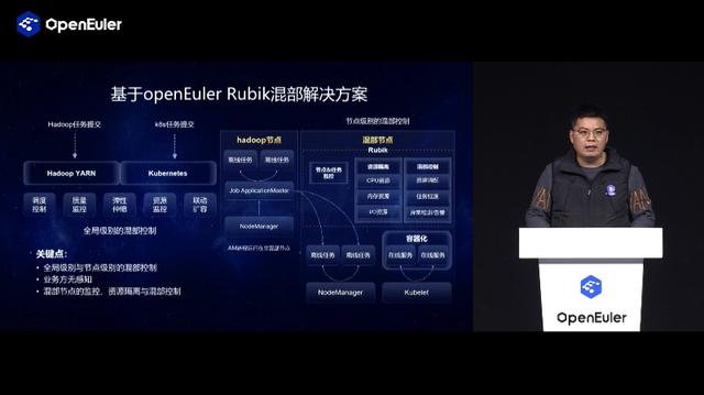 除了内核级别的资源调度,在 openEuler 操作系统中,还实现了两种不同层面的混合部署:在线/离线业务混部和软硬实时混部。从这个角度看,openEuler 志在实现更多更大场景的统一管理和运筹。我们先来看一下在线/离线业务混部: