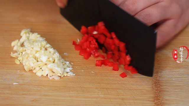 2、接着准备一些大蒜,切成蒜末备用,一小块红椒先切成细丝,然后再切成小丁,切好装盘备用。
