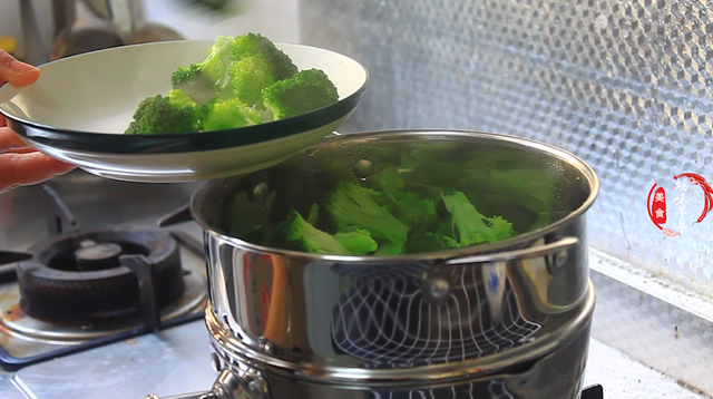 4、浸泡好的西蓝花用清水多洗几遍,这样洗的西蓝花非常的干净,然后放入到蒸屉里面,等鸡蛋快煮熟时,放入西蓝花,蒸上3分钟就可以了。这样做出的西蓝花颜色非常翠绿。