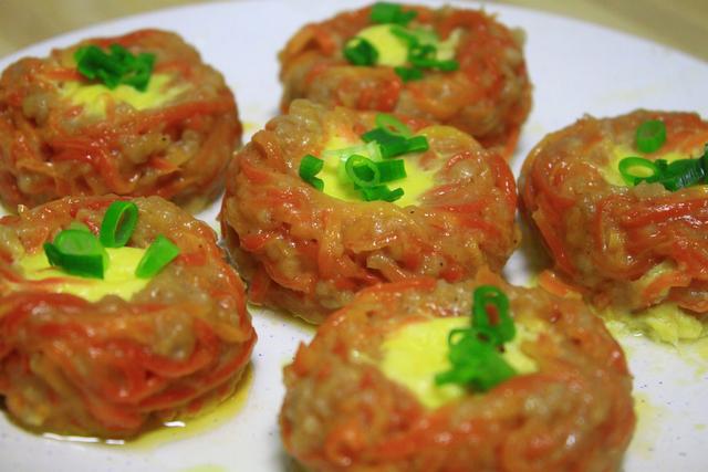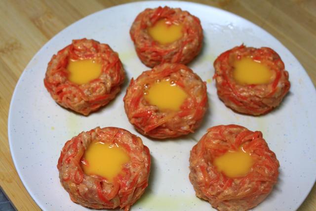 3、加入五香粉、蚝油、搅拌均匀、搅拌均匀后,用手团成大小均匀的丸子。然后再中间旋上一个窝。将打散的鸡蛋液倒入窝里。