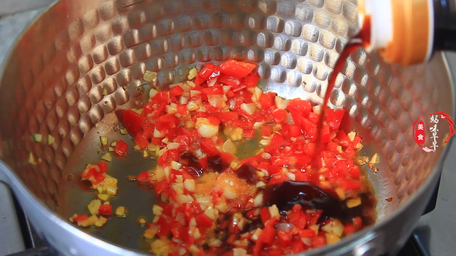 6、锅里倒入适量的油,油热后下入蒜末红椒炒出香味,加一勺盐、一勺蚝油、一勺生抽,将调料翻炒均匀。