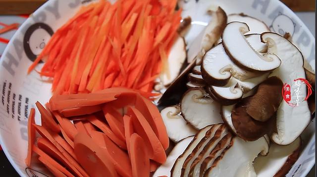 3,准备一块嫩豆腐,先给它切成薄片,然后再切成长条,两三个香菇洗净切成薄片备用,一根火腿肠切成薄片备用,半个胡萝卜切成丝备用。