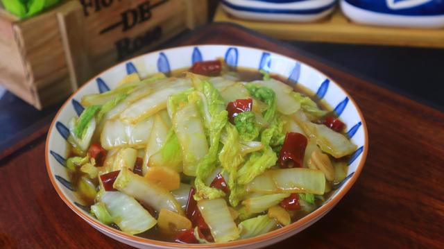 7、锅里倒油,热油后下入蒜片和干红椒炒出香味,干红椒提前泡一下,这样炒的时候就不会发黑,然后下入白菜帮,把它翻炒上30秒,接着下入白菜叶子,把它炒至变软,最后淋入调好的料汁,大火翻炒出香味就可以出锅了。